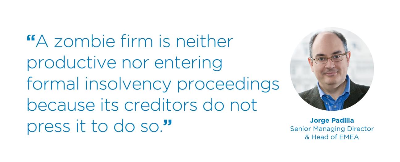 Jorge Padilla defines “zombie firms” as firms that cannot recover their debt servicing costs from their current profits over an extended period. They manage to stay in business via a symbiotic relationship with banks – the latter extending their loans rather than acknowledging that these are non-performing. A zombie firm is neither productive nor entering formal insolvency proceedings because its creditors do not press it to do so. They do not engage in capital growth or investment. In terms of metrics, interest coverage ratio and Tobin’s Q (a measure of market capitalization over assets) can help identify them.