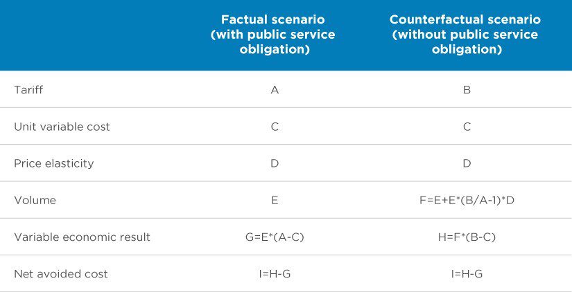 For example, Table 1 below broadly illustrates the EC’s approach to calculating the net avoided cost of Poste Italiane S.P.A.’s (PI) obligation to offer reduced tariffs to publishers and not-for-profit organisations, when Italian authorities notified the EC of the compensation for this service in 2019.[28] In particular, the EC considered that (i) in the counterfactual PI would have set tariffs to publishers and not-for-profit organisations at the higher, capped Universal Service Obligation (USO) price; and (ii) it was possible to estimate the price elasticity of demand based on a 5-month period in 2010 when PI applied the USO price to its press distribution mission. Based on these, the EC compared variable profits in the factual and counterfactual scenarios to calculate net avoided cost.