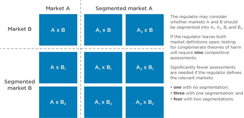 However, leaving market definitions open has a cost. Parties must derive market shares for hypothetical market segments they may not rationally track during their normal course of business. Additionally, those hypothetical market segmentations also exponentially increase the number of combinations of potential markets for which regulators need reassurance that there can be no conglomerate theories of harm. Figure 1 illustrates the snowballing impact this has. So, although leaving market definitions open may save resources related to work on market definition, it has a compounding opposite effect on the resources needed to assess potential effects on competition.