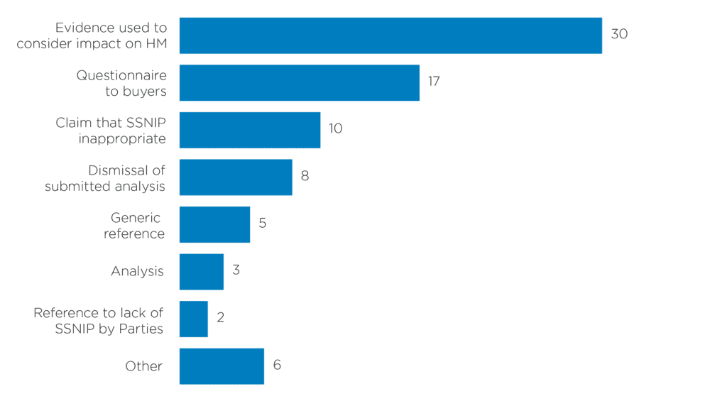 We have also analyzed recent merger decisions by the UK Competition and Markets Authority, which show more active consideration of the SSNIP test concept. Of the 482 published merger cases since 2010, 108 (22.4 percent) mentioned a hypothetical monopolist, a SSNIP test, or critical loss analysis. Of these, 83 implement an SSNIP test, 62 of them through a conceptual discussion of the available evidence, 20 through issuing questionnaires based on the SSNIP test concept to buyers, and four through conducting quantitative analysis, such as a critical loss calculation or estimation.[14]