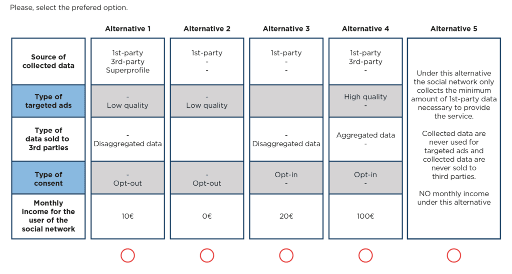 The survey included (a) an initial questionnaire about the respondents’ socio-demographic characteristics, their use of social networks, and their knowledge of how social networks collect and use their data; and (b) a series of choice experiments, where respondents had to choose among various social networks differing, among other things, on the nature and amount of data collected, the uses given to such data, the quality of the ads being shown, and the amount of money respondents would be paid for their data.