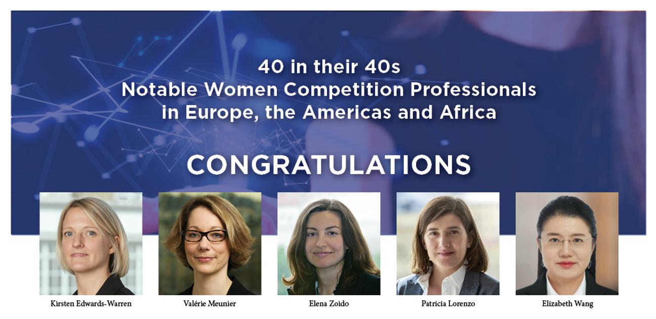 Today, on International Women's Day, we are proud to announce that five Compass Lexecon experts have been recognized by W@Competition in their '40 in their 40s Notable Women Competition Professionals' 2019 list. Kirsten Edwards-Warren, Elizabeth Xiao-Ru Wang, Elena Zoido, Patricia Lorenzo and Valérie Meunier are among the 40 finalists listed in the Economics & Academia category. The independent judging panels selected 40 finalists per category from about 800 nominations submitted by peers across the global W@Competition network.