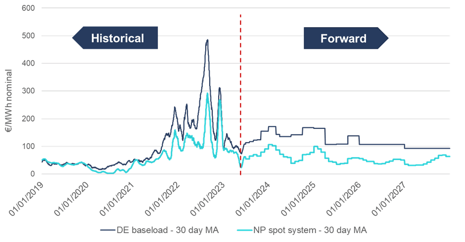 Figure 1 – Daily power price (EUR/MWh). Source: Compass Lexecon based on Energy Market Price. Note: Prices are 30-days moving averages, as of June 20, 2023.