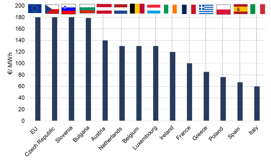 Figure 3 – Level of the cap on market revenues for onshore wind in selected EU countries. Source: Compass Lexecon, based on European Council, Bruegel, Reuters, Balkan Energy News, Eurelectric, EU Parliament, Tax Foundation, Governments of France, Belgium, Ireland, Netherlands & Spain, Bulgarian Photovoltaic Association. Note: In Austria, if investments in the energy transition can be proven, the level of the cap increases to up to €180.