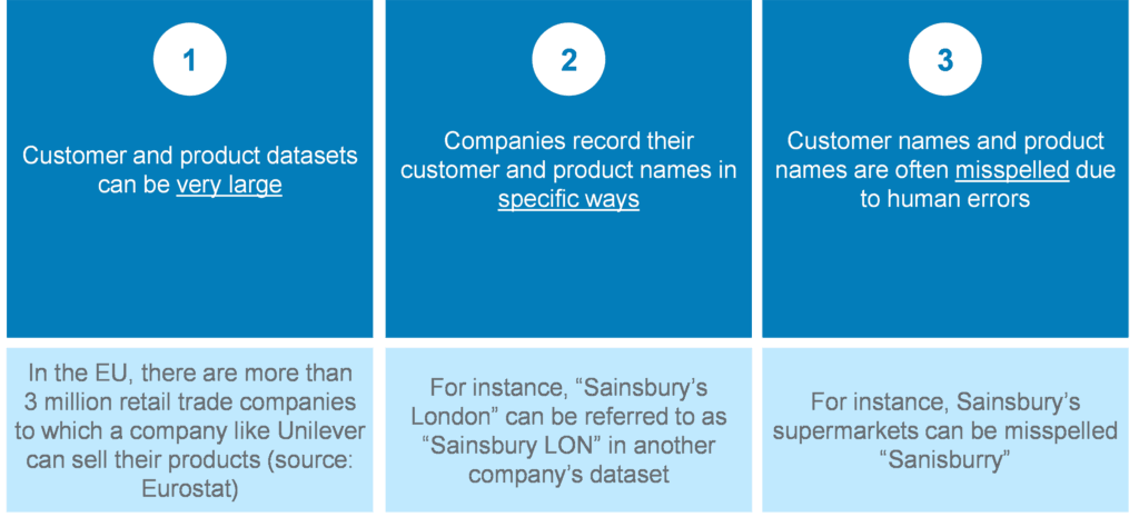 This exercise is traditionally performed by manually inspecting the lists and identifying matches based on “intuition”. For smaller datasets, near-perfect results can be achieved this way, although it is time-consuming. For larger datasets, manual inspection is very challenging - if not impossible when deadlines are tight – with a high risk of manual errors.