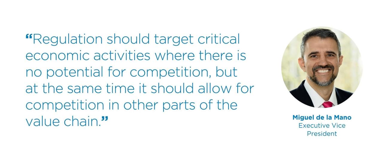 Miguel started by saying that regulation should target critical economic activities where there is no potential for competition but at the same time, it should allow for competition in other parts of the value chain. Economic regulation should also serve as a surrogate for competition. Finally, the potential for competition should be assessed over a sufficiently long timeframe with milestones established to remove regulation and attract new entrants as soon as materially possible. This ensures that direct regulation is not self-perpetuating. Benefits of regulation from