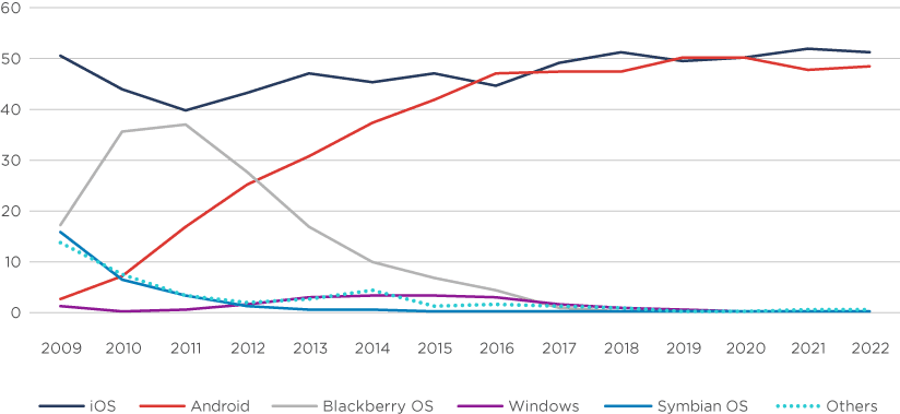 Figure 1: Market share of Mobile OSs in the UK, 2009-2022