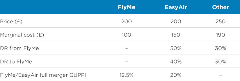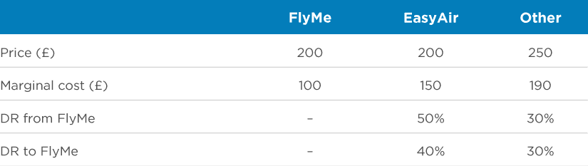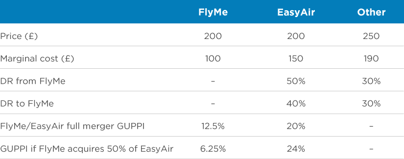 Suppose that there are two main airlines flying between London and Rome, and some small competitors. One airline, FlyMe, proposes to merge with its competitor, EasyAir. To assess whether the owner would increase prices for either airline after the acquisition, the competition authority collects the following information on prices, costs and diversion ratios.