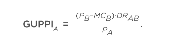 The basic GUPPI for a full merger of firms A and B is calculated as follows. For Firm A, multiply the profit per unit of Firm B’s product with the diversion ratio from firm A to B and divide by the price of Firm A’s product. If we denote the price of the product of firm B by PB and the marginal cost of producing it by MCB , so the profit per unit of the product is PB – MCB ; and denote the Diversion Ratio from Firm A to B as DRAB ; then: