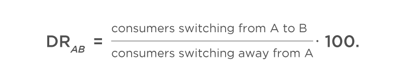 The diversion ratio from A to B is the share of consumers leaving A who end up buying from B. The formula for the diversion ratio divides the number of consumers switching from A to B by the total number of consumers leaving A after its price increase. The diversion ratio as a percentage is