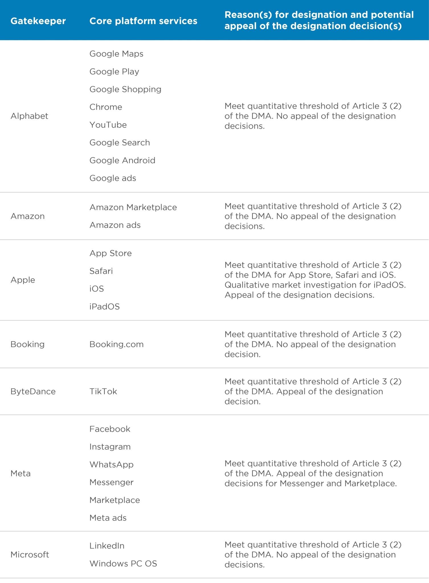 At first glance, its formal rules seem to have been a success. The Commission has applied them to catch seven gatekeepers, namely Alphabet, Amazon, Apple, ByteDance, Meta, Microsoft and Booking (see Table 1 in the Appendix).[7] This outcome aligns with expectations. It is, however, unclear whether it results from any robust, sound economic assessment or the combination of strict rules and strong priors.