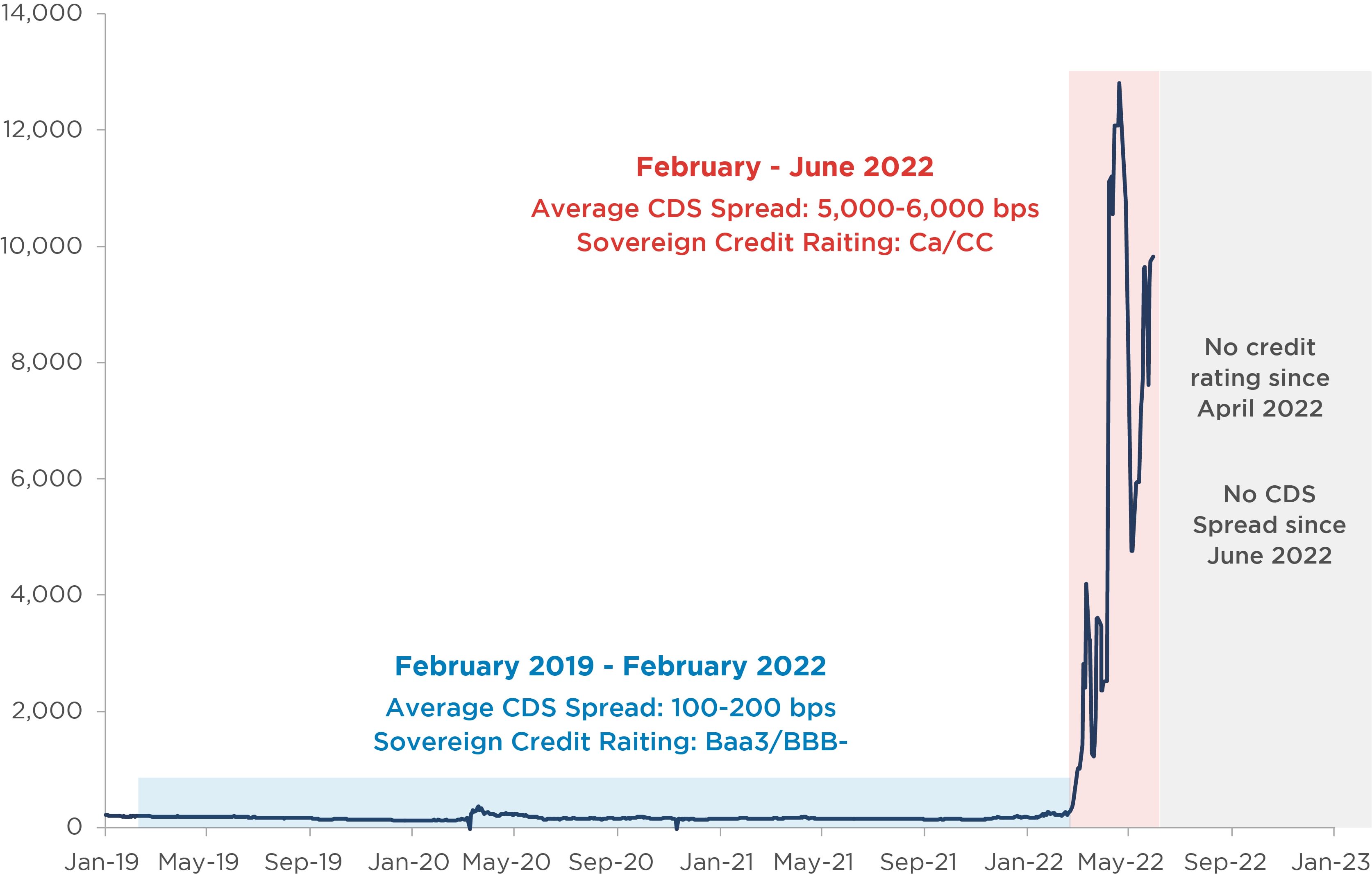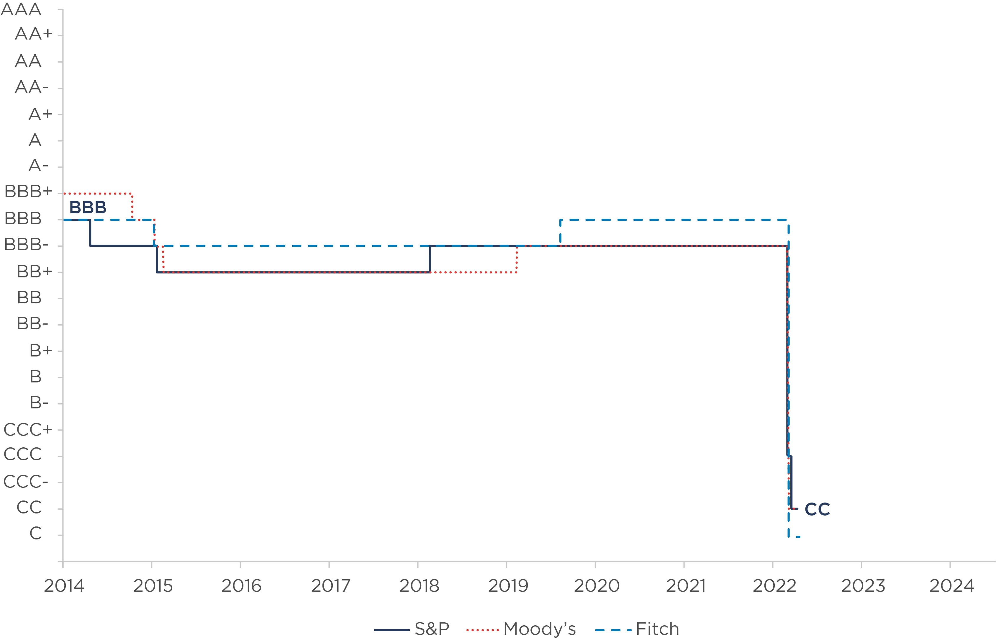 Initially, Russia’s sovereign rating was downgraded from BBB-/A-3 to BB+/B with a negative outlook immediately following the military intervention. This reflected the anticipated impact of newly announced sanctions and heightened geopolitical uncertainty on foreign trade and economic activity, domestic and private-sector confidence, financial stability, and growth.[19] Subsequent international sanctions targeted the foreign exchange reserves of the Central Bank of Russia—rendering them inaccessible and impairing Russia’s net external liquidity position. In response, Russia introduced capital controls through countersanctions, leading to a further downgrade to CCC-.[20]