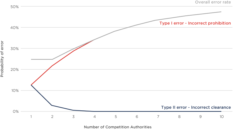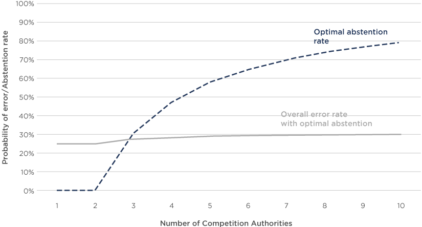 The reason for the moderate increase in the overall regime error rate is that moving from one to three CAs all but eliminates the chance of a false clearance – as this requires all three CAs to wrongly conclude an anti-competitive deal is pro-competitive – and this collapse in false clearances is only somewhat outweighed by the increase in false blocks (which require only one CA to wrongly block a pro-competitive merger).
