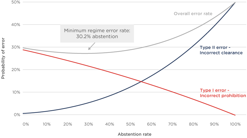 Importantly, abstention is a sticking plaster. Even at the optimum level of abstention, the regime can never improve on the outcomes that a single CA acting alone could achieve. The figure below shows the overall regime error rate as the number of CAs increases assuming the optimum abstention rate is adopted in each case. The total error rate (the solid grey line in Figure 3) is marginally higher than the one with just one CA reviewing in all cases, and those errors skew toward incorrect prohibitions, with around four incorrect prohibitions for every incorrect clearance. Furthermore, the optimum abstention rate needed to achieve those outcomes gets larger (the dashed line in Figure 3), and increasingly challenging to achieve in practice, as the number of CAs increases. So, the abstention approach becomes increasingly difficult to achieve in practice, and always falls short of the outcome that a single CA acting alone could achieve.