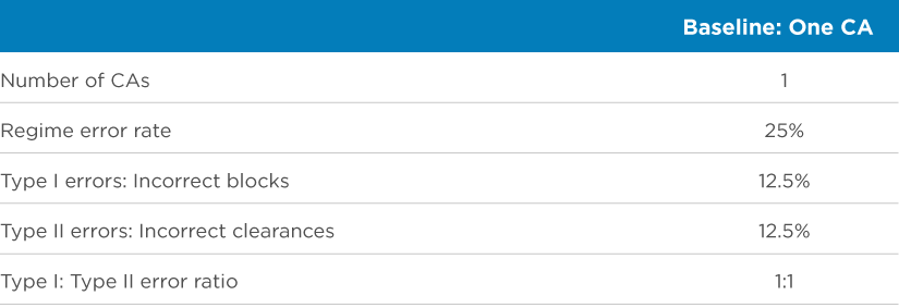 The figure below shows how the overall regime error rate increases as the number of CAs increases from two to ten, and how the overall error is split between incorrect prohibitions and incorrect clearances.