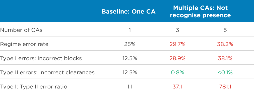 As we can see, moving from one to three CAs moderately increases the regime error rate, from 25% to 29.7%. However, the mix of incorrect blocks and clearances changes dramatically, from equality (1:1) to 37:1 in favour of incorrect blocks.