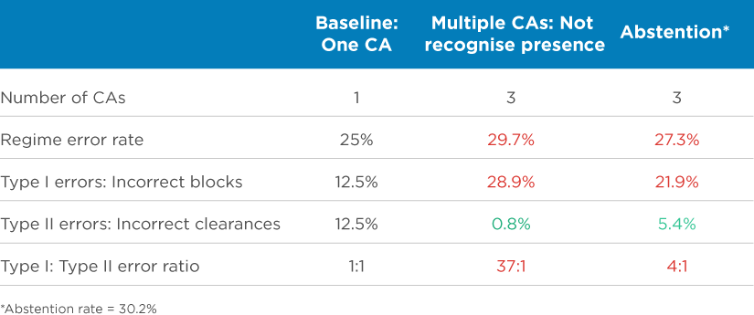 The table below sets out how the error rates under abstention (in the case of three CAs) compares to our previous scenarios.