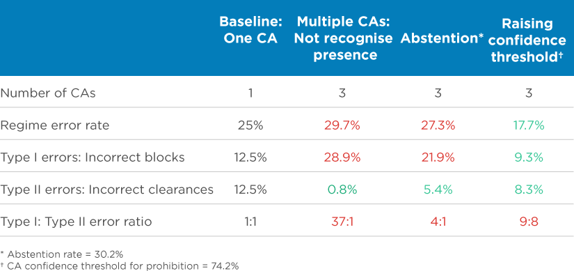 Adopting raised thresholds of confidence can lead to a strictly better overall regime error rate than any of the other approaches discussed, and better than the single CA can achieve. At the optimum confidence threshold, the regime error rate is almost a third lower (17.7% compared to 25%) than under a single CA system. This is because the regime is able to use the increased amount of evidence gathering to improve decision making.[14] It also leads to markedly improved rates of incorrect blocks and incorrect clearances compared to the abstention approach.