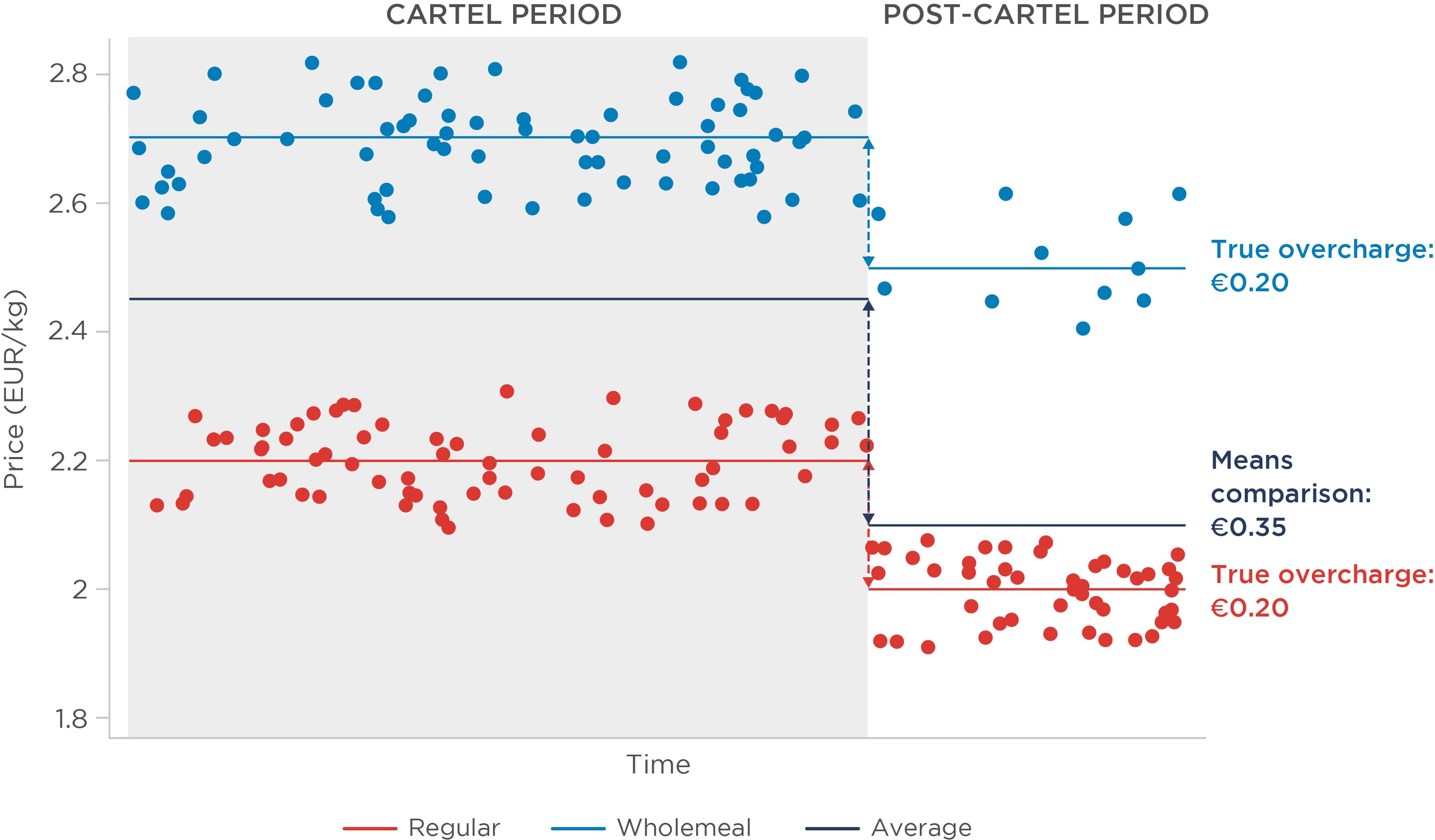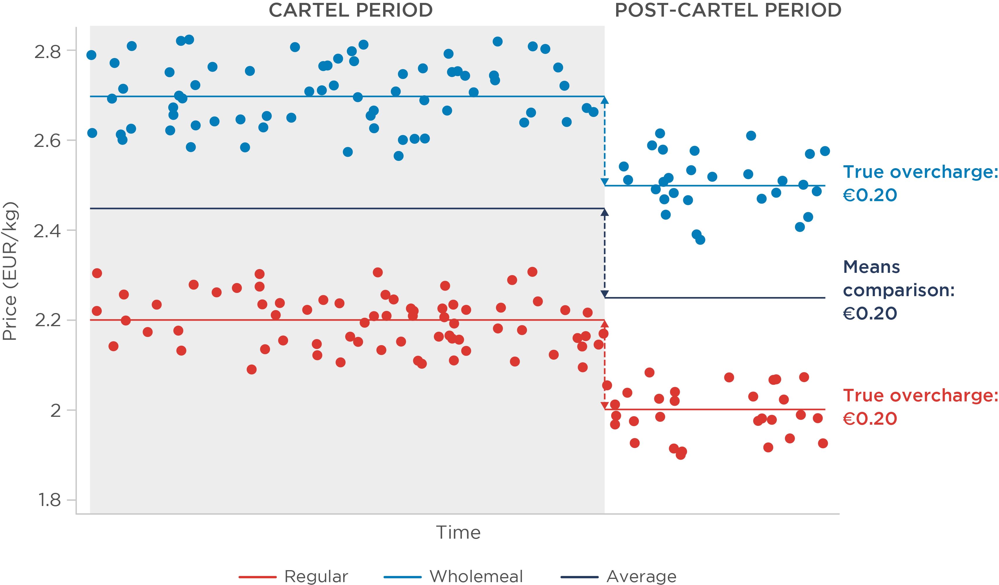 As illustrated, the combined average price after the cartel period is now much lower than in either of our previous examples. However, the larger estimated overcharge is simply driven by the composition change, as the end of the cartel coincides with an increase in sales of the cheaper type of flour.