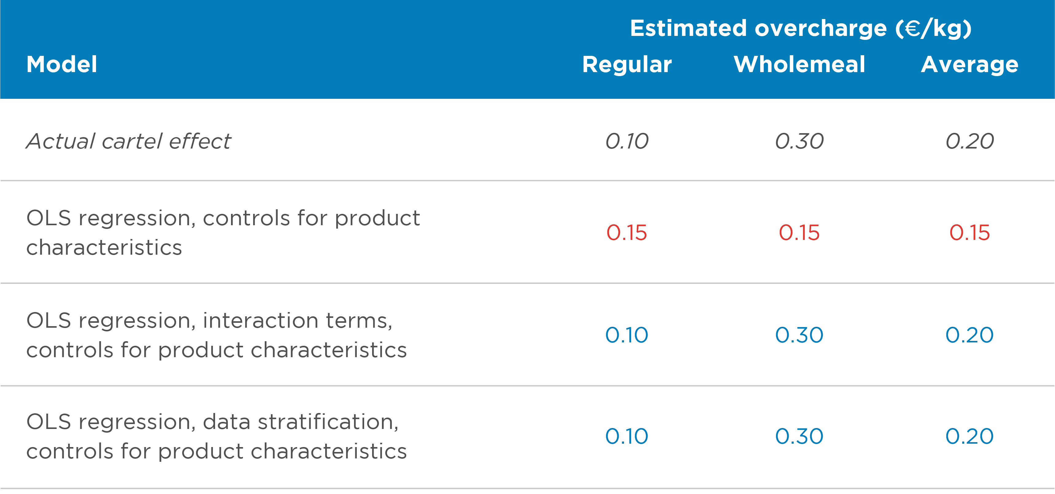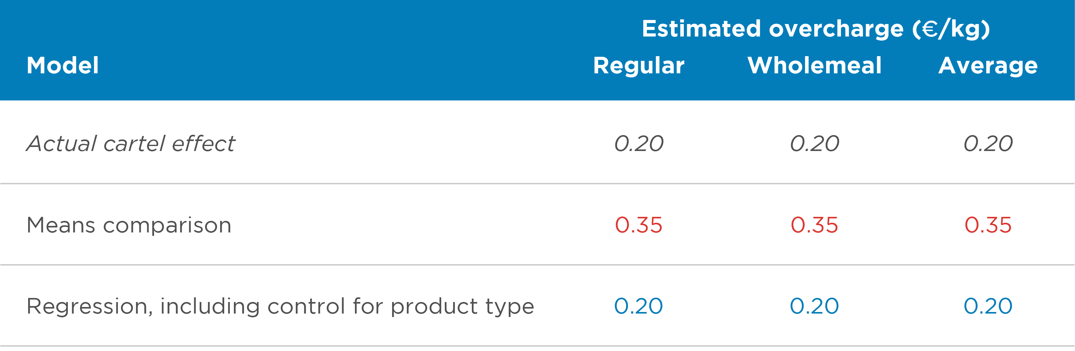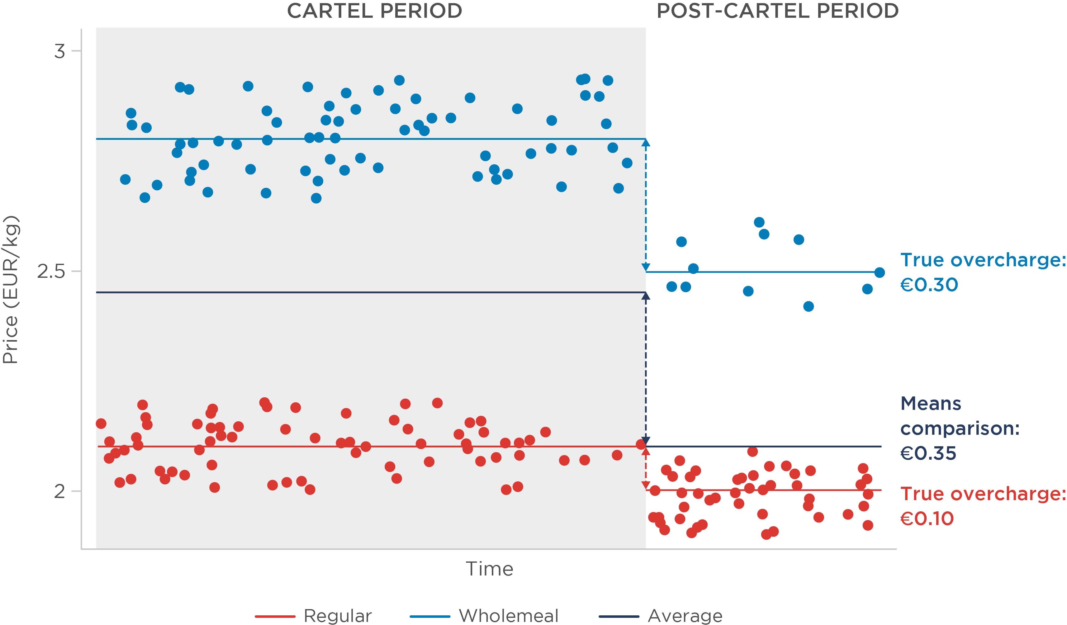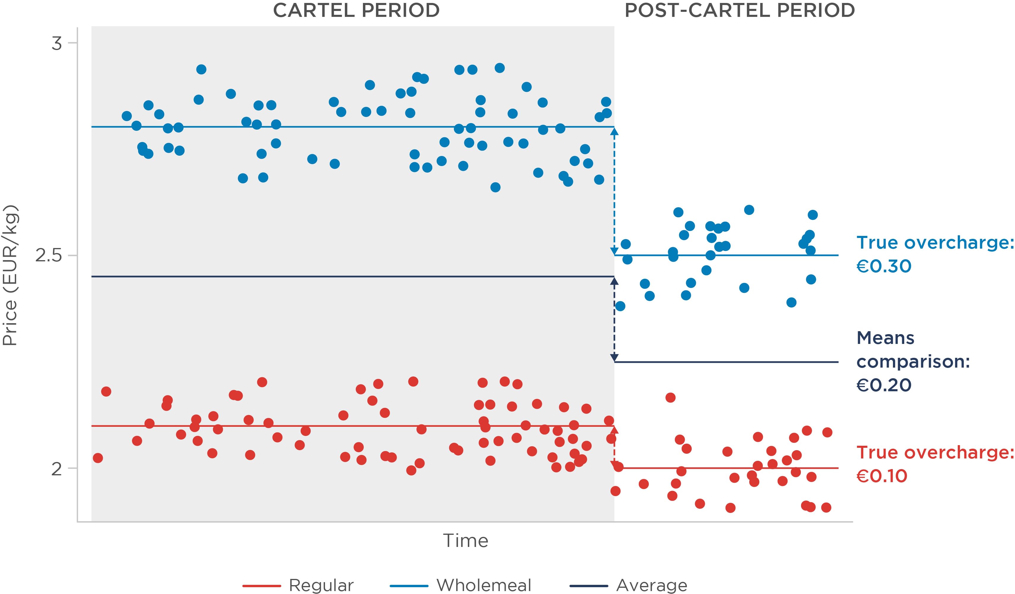 When effects are heterogeneous (Figure 2), the true overcharge varies between regular (€0.10/kg) and wholemeal (€0.30/kg) flour. This can happen in different circumstances and for different reasons. For example, the cartel may cover a larger share of the supply of wholemeal flour, or the demand for wholemeal flour may be less elastic. A single estimate is not sufficient to convey this range of overcharges, and instead merely results in an average of the two effects.