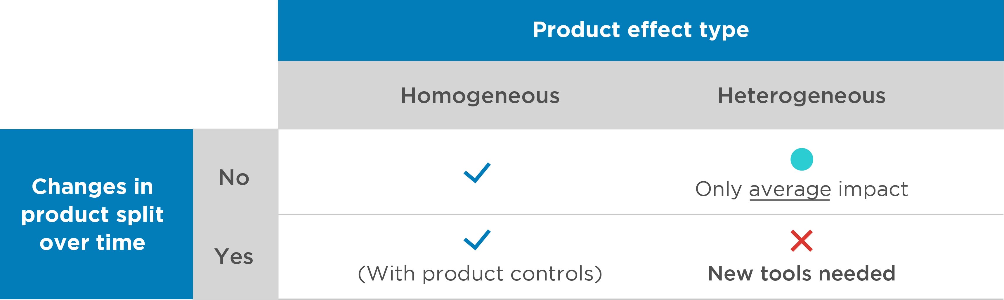When relying on means comparisons or regression analysis leading to a single average effect, the results should therefore be interpreted cautiously. Where heterogeneous effects are anticipated, practitioners need to explicitly acknowledge that they are, at best, capturing the average effect across all customers. A customer who bought more of one product than another will then receive inappropriate compensation.