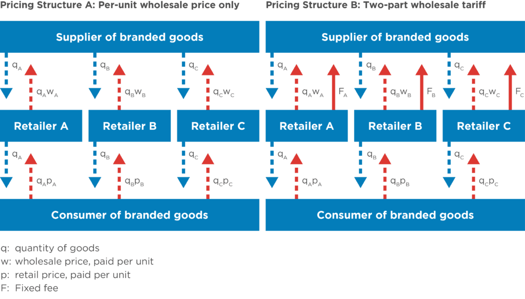 Two-part tariffs can have benefits for both consumers and firms when there are risks of double marginalisation – that is, when both upstream and downstream firms have some market power. Relative to simple per-unit pricing, two-part tariffs mean that the downstream firm faces a per-unit price closer to marginal costs, and final consumer prices will be lower as a result. In practice, pricing and quantity agreements between suppliers and retailers can be quite complex, determining the product ranges retailers can sell, the quantities they receive, and the per-unit prices they have to pay. Formally though, these agreements may often look similar to two-part tariffs – the supplier sets a per-unit price along with further requirements which effectively impose a cost on the retailer that is not linked to the number of products it sells.