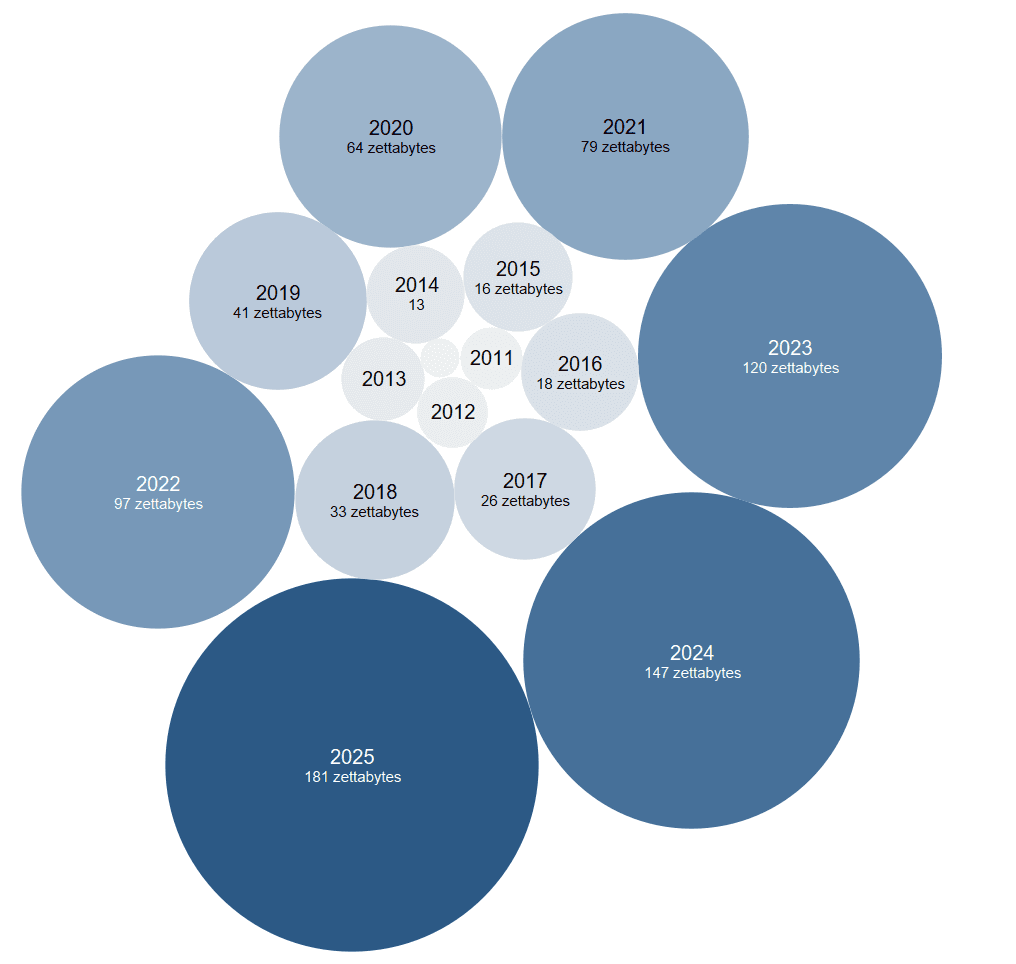 Figure 1: Volume of data/information created, captured, copied, and consumed worldwide from 2010 to 2025 (2021-2025 forecasted), in zettabytes (1 zettabyte = 1 bn Terabytes)