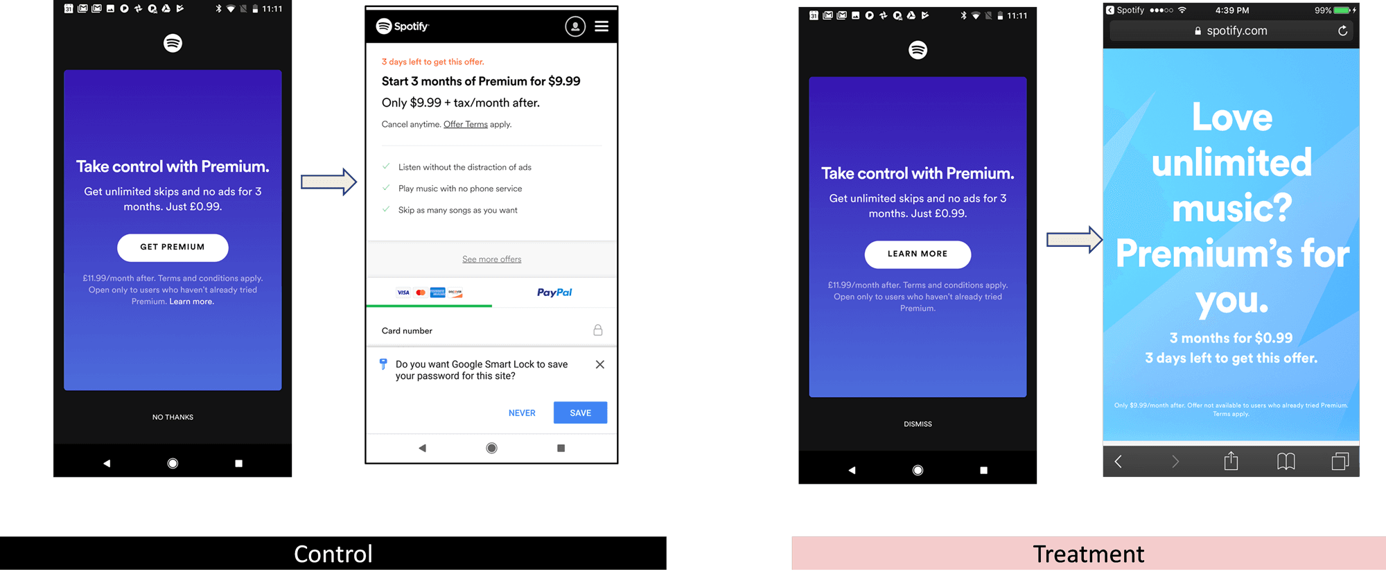 - In the first of these, Spotify created an iOS-style variant of its app for a randomly selected 10% of all new users downloading its app on Android. It then tracked how many converted to Premium during and after its biannual promotional campaign, compared with the ‘control’ group receiving the regular app.