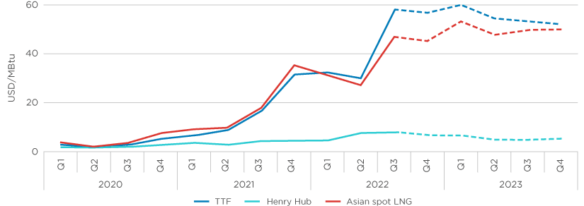 There has been an unprecedented increase in energy prices since 2020. Most European countries rely heavily on gas, which is the primary driver of the recent power price increase. This is because gas-fired power stations are typically the marginal generators of electricity, so their production costs drive power prices. In Europe, third-quarter 2022 Dutch gas prices (TTF) were more than eight times their five-year average. Asian spot liquefied natural gas (LNG) prices rose in Q3 2022 to their highest quarterly level on record (Figure 1). In Europe and Asia, forward curves as of the end of September 2022 expected prices to remain at high levels in 2023.