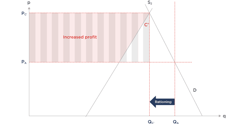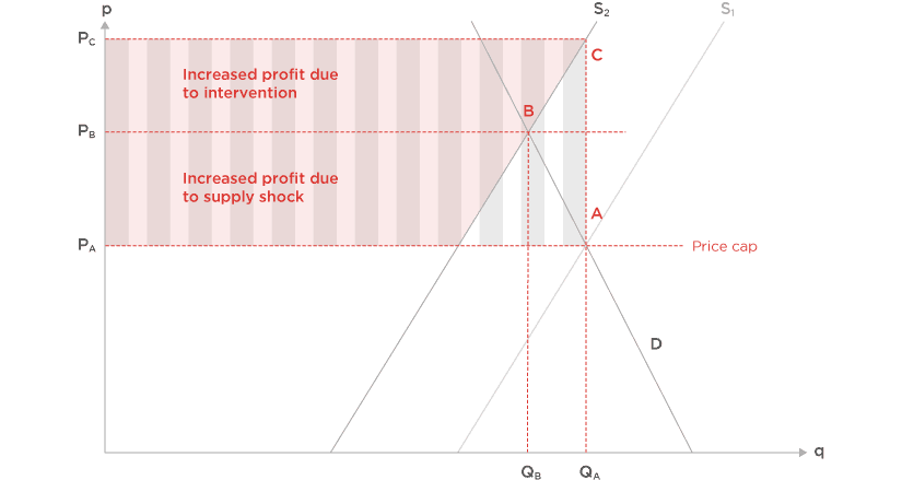 As a result, the price that the government pays for energy will be even higher than market prices in the absence of intervention, as is illustrated in Figure 4. At the capped price of PA, consumers wish to consume QA units of energy – the same as they were consuming before the supply shock. But higher prices are required to bring forward this amount of energy. The market price rises to PC, which is the corresponding price for QA on the new supply curve S2. Energy providers thus receive even higher profits, and the government pays the difference between PA and PC (grey shaded area).