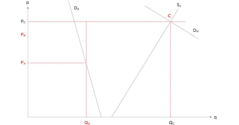 The left-hand part of the figure shows outcomes for consumers with regulated prices, which we assume to be capped at PA, the price before the supply shock. They consume quantity QR at this price, more than they would have done at PB. As a consequence, prices increase for everyone else, to a level higher than they would have faced without intervention. In the right-hand part of the figure, the curve DM shows demand from consumers exposed to market prices. Market prices are not capped, so prices are determined by the intersection between the demand and supply curves, at point C. Overall market prices are PC, while the total quantity of energy consumed is QC. Note that PC is higher than PB (and QC is greater than QB). This is because consumers facing regulated prices have no incentive to reduce their demand. Instead, all demand reduction comes about through the group of consumers exposed to market prices, and higher prices are therefore required to achieve the same level of demand reduction. The untargeted group faces the burden both of higher prices and of energy-saving efforts.