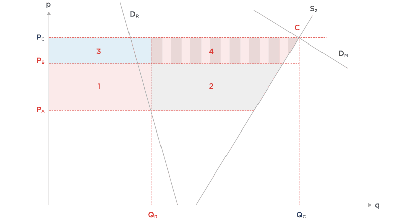 Figure 7 displays the welfare consequences of this intervention. As a result of the supply shock, suppliers’ profits increase by the sum of areas 1, 2, 3 and 4. Areas 1 and 2 are the same as the red shaded area in Figure 2 (as the price increased from PA to PB). However, area 1 is now paid for by the fiscal authority, rather than by consumers. Areas 3 and 4 represent additional profits for firms, due to the increase in prices following the subsidies. Area 3 is paid for by the fiscal authority, while area 4 is paid for by consumers exposed to market prices.