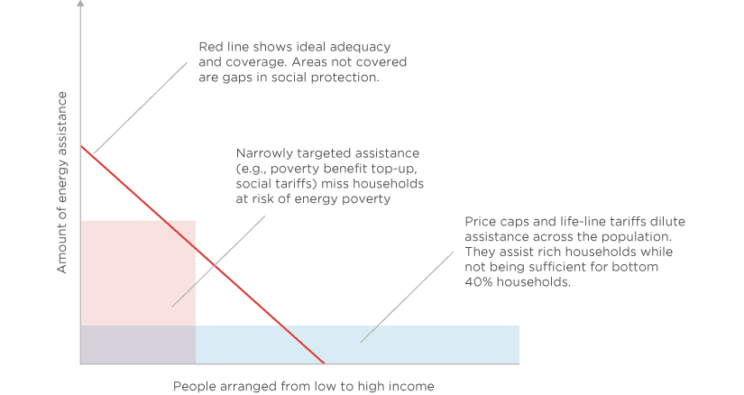 The trade-offs involved in subsidising energy consumption can be seen in Figure 8, created by the World Bank economist Nithin Umapathi. In this framework, the ideal approach would follow the red line, with high levels of assistance for the poorest groups, gradually tapering off as income increases. But in practice, governments face a trade-off between targeting assistance narrowly, as in the orange box, which could miss out lower to middle-income households, or providing broad-based support, which may be insufficient for the poorest groups. It should be noted, however, that while this framework is complicated enough in itself, governments will typically care about multiple dimensions of energy need, including for instance age and health status as well as income.