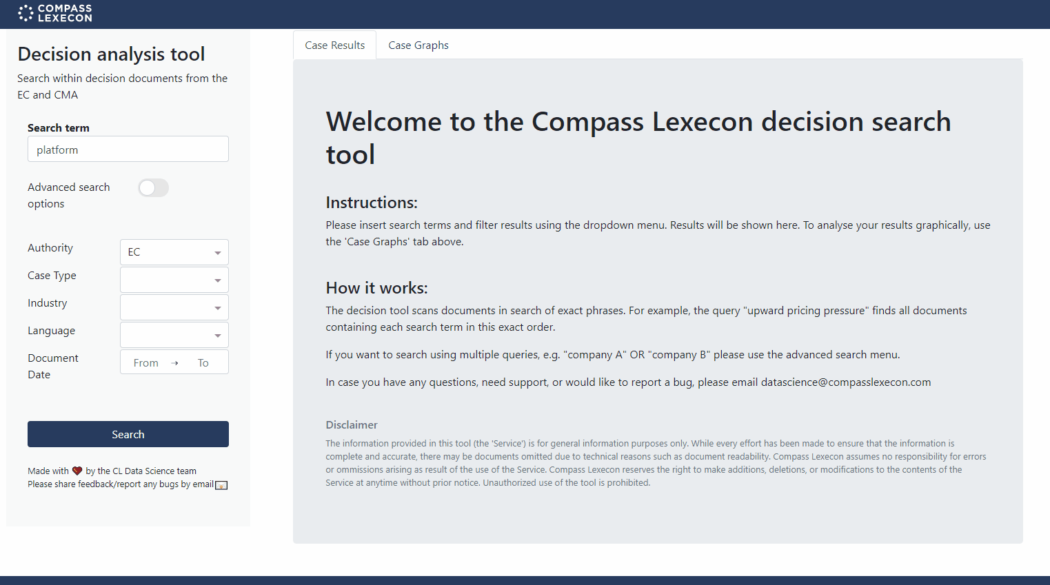 - Developing solutions to help clients leverage data, e.g., a tool for searching for specific terms or concepts in competition authority decisions